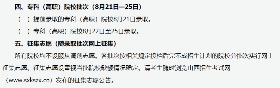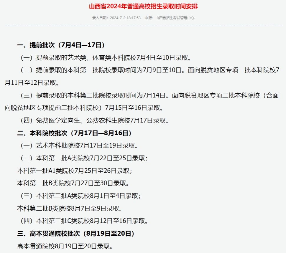 山西省2024年普通高校招生录取时间安排