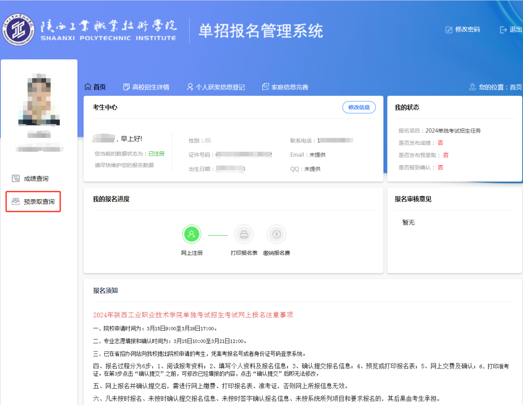各位考生可登录我校招生网(http://zsw.sxpi.edu.cn/)“单招报名系统”查询预录取结果。