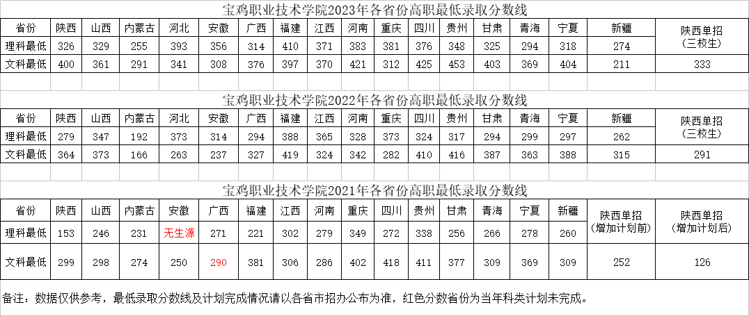 各位考生及家长,欢迎报考宝鸡职业技术学院,为方便大家了解学院历年最低录取分数线相关信息,特汇总如下: