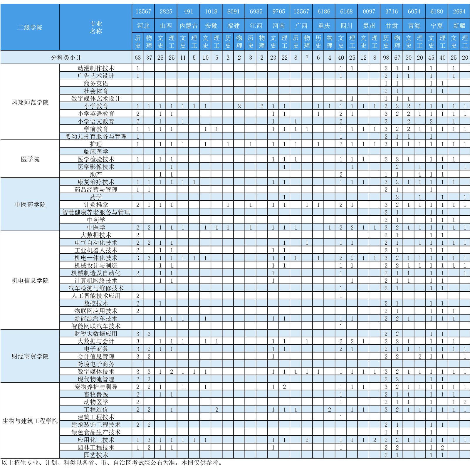 2024年宝鸡职业技术学院外省高职计划分布表