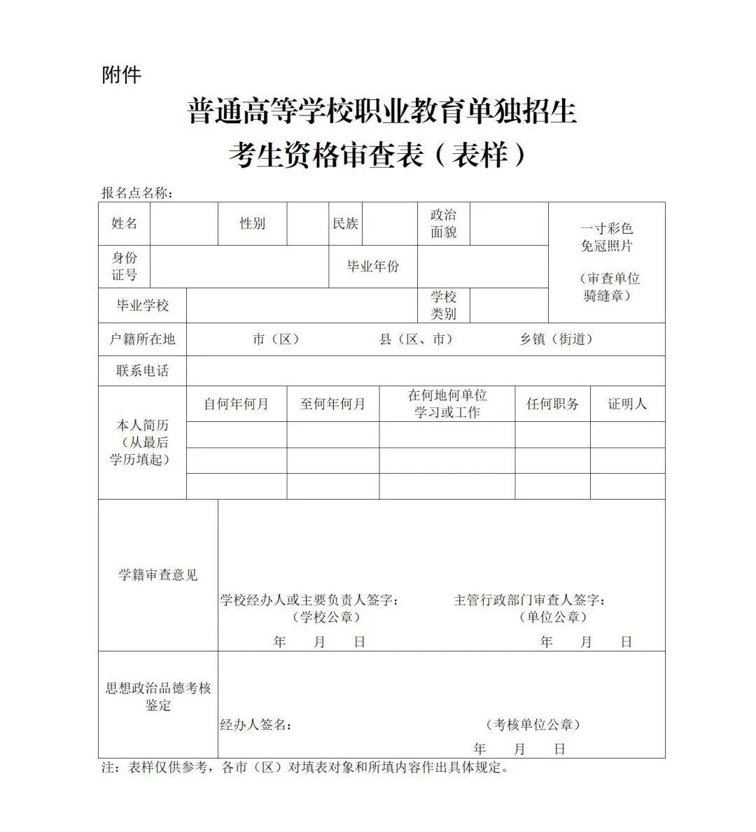 (二)我省“三校生”在学籍(毕业中学)所在市(区)指定的报名点报名,往届“三校生”也可在户籍所在市(区)指定的报名点报名。报考者应于报名前到报名点领取《普通高等学校职业教育单独招生考生资格审查表》(表样见附件),准确填写个人信息,并接受报考资格审查。