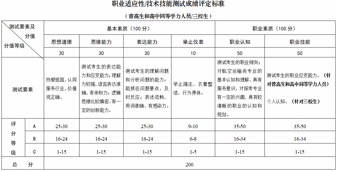 职业适应性和技术技能测试(面试)在于考察学生综合运用高中(中职)阶段所学知识和技能的基本情况。测试学生是否适应航空运输类专业的学习,是否具备相关专业学习基础和学习能力;测试学生学习意向、仪表仪态、思辨能力、心理素质、沟通能力、应变能力、才艺、特长等方面的综合素质;测试学生对于专业与职业的认知和想法,对于服务意识、服务礼仪、急救常识的掌握;测试学生是否具有良好的逻辑思维和语言表达能力;是否具备良好的职业道德和职业素养。