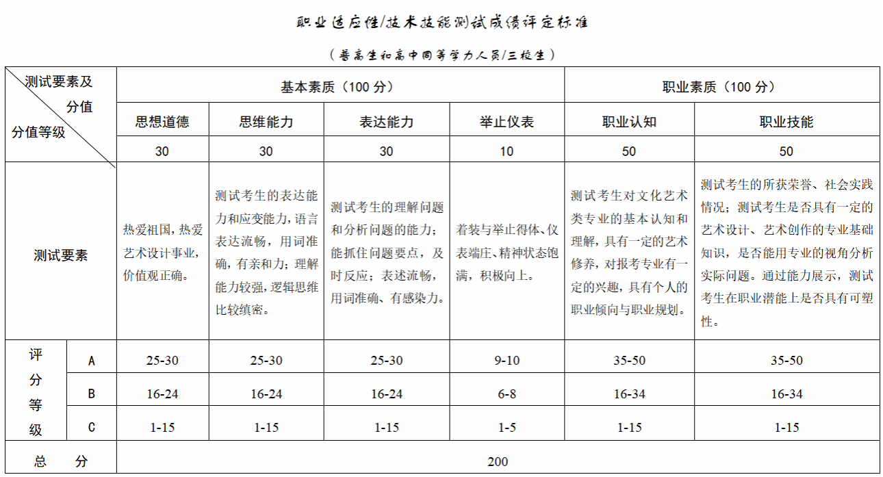 职业适应性和技术技能测试(面试)在于考察学生综合运用高中(中职)阶段所学知识和技能的基本情况。测试学生是否适应艺术设计类专业的学习,是否具备相关专业学习基础,是否具备艺术设计类专业的基本技能,是否具备简单的专业操作能力;是否具备艺术设计类专业的语言学习能力;是否具备艺术设计类专业的操作能力;是否具有良好逻辑思维和语言表达能力;是否具备良好的职业道德和职业素养。