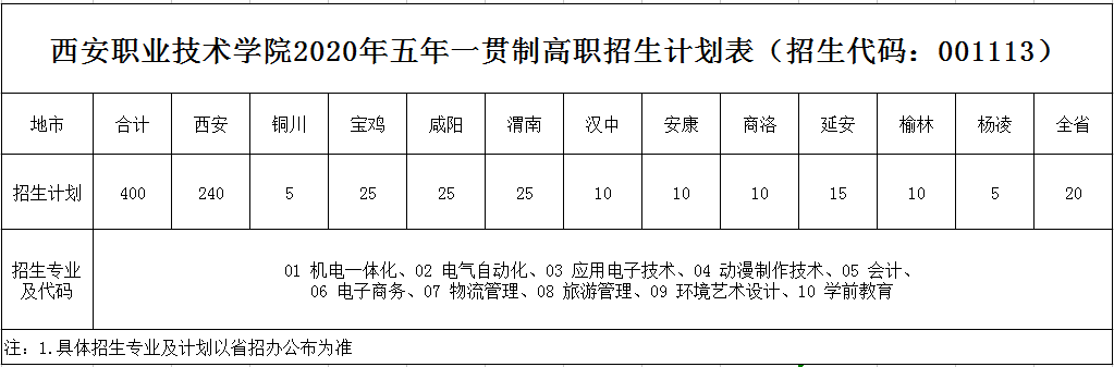 西安职业技术学院2020年五年一贯制高职招生计划表(招生代码:001113)