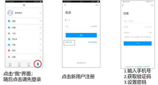 打开安装好的学习通App,可以看到如下图左的应用首页,点击右下角的“我的”,进入如下中图的界面,点击上方灰色头像,进入注册登录界面,选择“新用户注册”,输入手机号,获取验证码,然后设置密码。