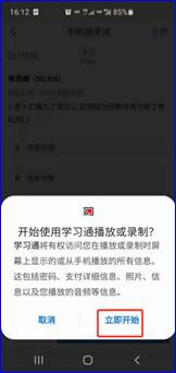 2.拍摄自己的对比照片,用来人脸识别比对。识别完成之后点击“立即开始”学习通的监考权限,点击取消则无法正常答卷。