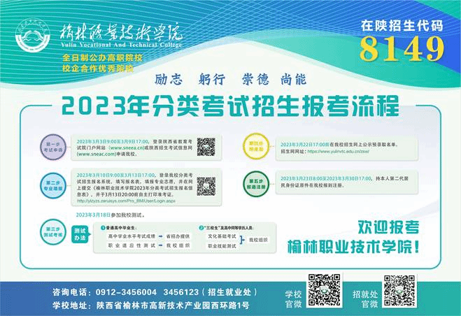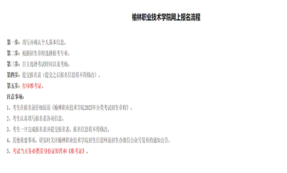 向我校提出入学申请的考生须于2023年3月10日9:00至3月13日17:00登录我校2023年分类考试招生报名系统(网址:http://ylzyzs.zeruisys.com/Pro_BM/User/Login.aspx),填写报名信息、填报专业志愿,并在网上提交《榆林职业技术学院2023年分类考试招生报名信息表》,并于3月13日20:00前自主打印准考证。