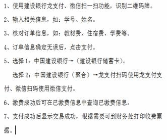 建设银行网上缴费平台为学院学生提供微信和网上银行两种缴费渠道,7*24小时缴费,免去携带大量现金的烦恼,同时保证了您人身及财产安全,避免现场缴费同学多、排队长的弊端。