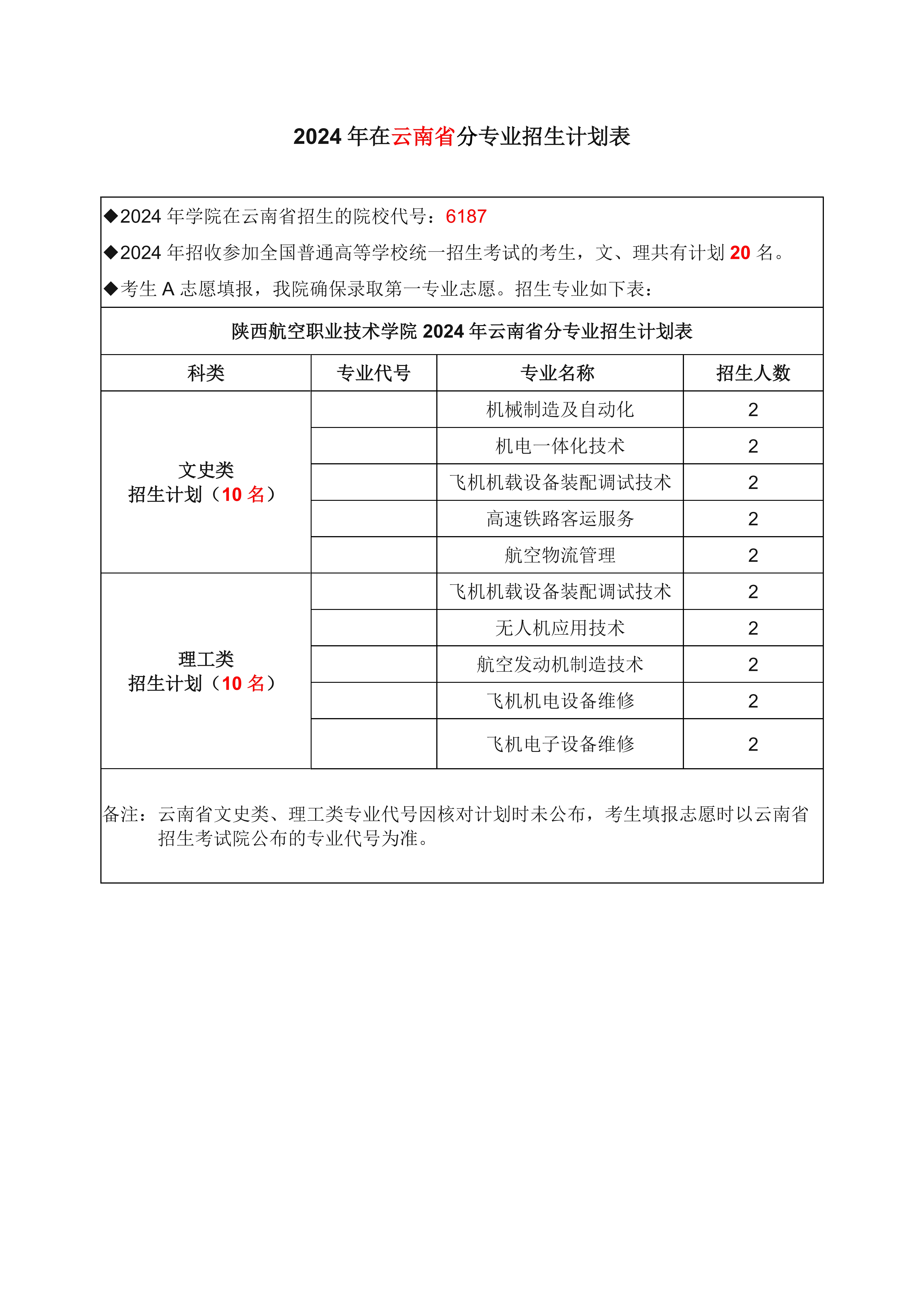 陕航职院2024年云南省招生专业计划表