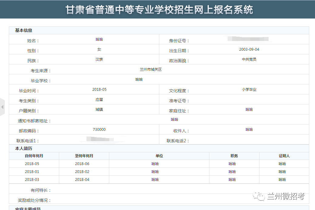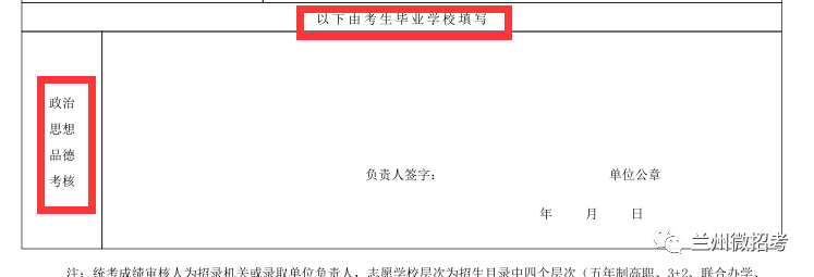 学校依据考生在校期间的表现进行评价并由负责人签字加盖学校公章。注意:报名登记表中考成绩栏信息需准确填写。报名登记表填写完成后需按要求前往县区招生机构进行现场审核,审核完成后考生需妥善保管入校时交由录取学校存档。其他相关事项请持续关注“兰州微招考”微信公众号。
