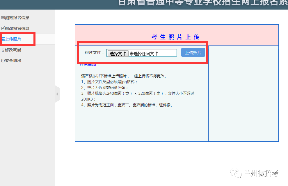 3.4上传照片考生报名信息填报成功后,务必登录系统上传本人近期单人照片。考生登录系统后,点击页面左边菜单中“上传照片”,如下图所示: