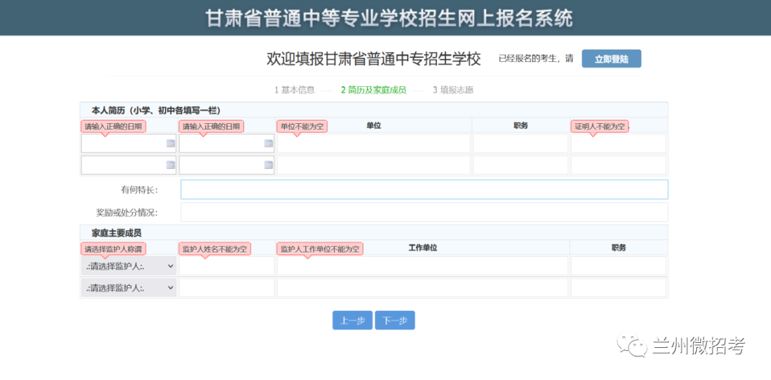 家庭主要成员:考生必须至少填写一位家庭成员(如果考生是由监护人管理,在“称谓”栏请选择“其他”,并填写监护人信息)。2.3志愿填报根据甘肃省教育考试院公布的2022普通中专招生计划、院校代码,选择填报志愿。填报志愿一个层次,五年一贯制高职、“3+2”联合办学模式、普通中等专业学校,考生可填报2所学校,每所学校可选报2个专业。