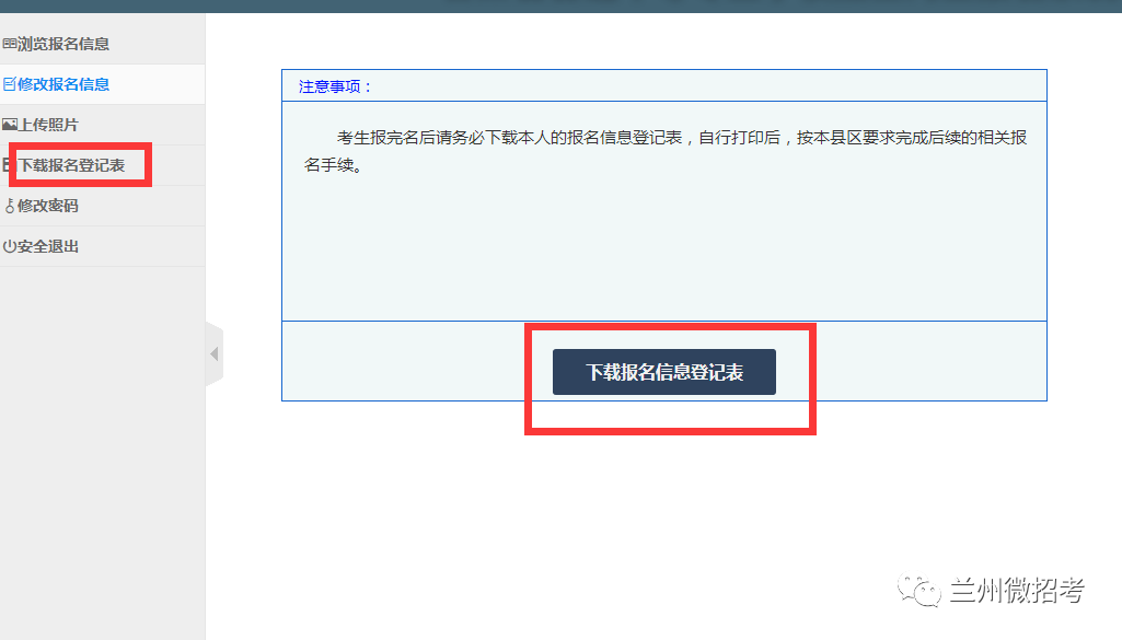 考生按照页面要求上传照片。4.报名登记表4.1 下载报名登记表照片上传成功后,如下图所示,下载报名登记表后打印。