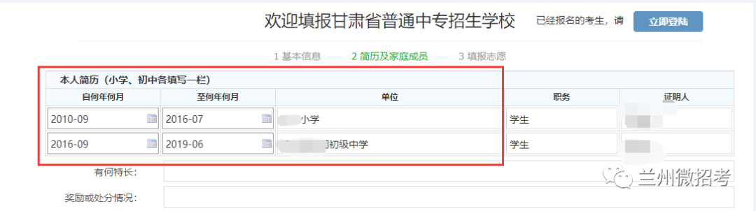 考生简历:请填写考生小学和初中的学习阶段。注意小学写一行,初中写一行。
