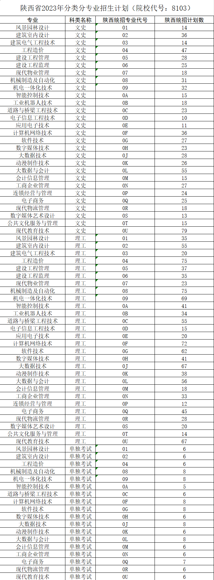 陕西省2023年分类分专业招生计划(院校代号:8103)