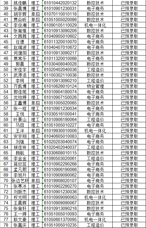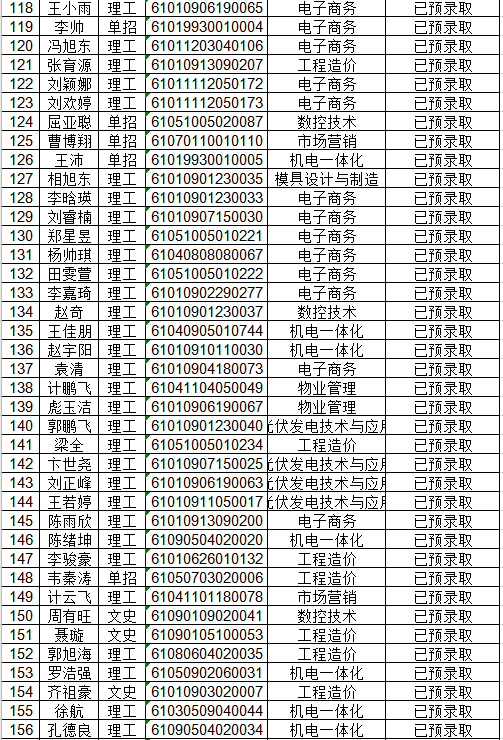 2020年陕西航天职工大学高职分类考试招生预录取名单