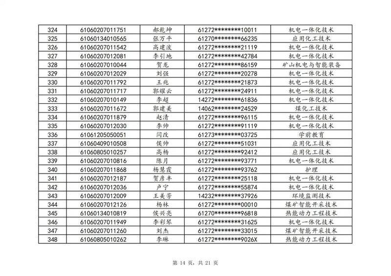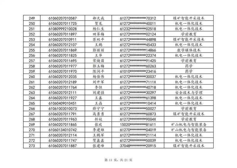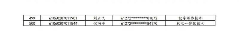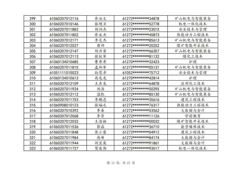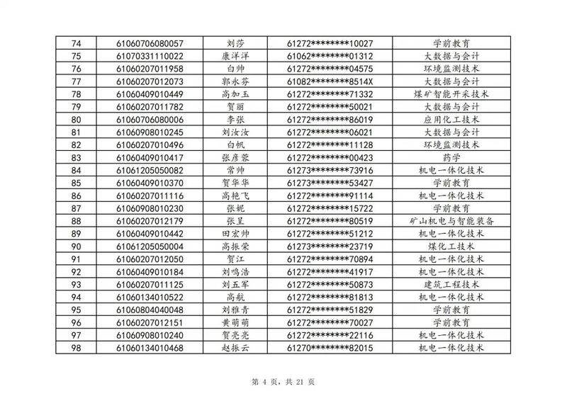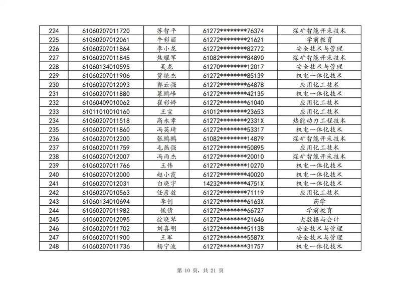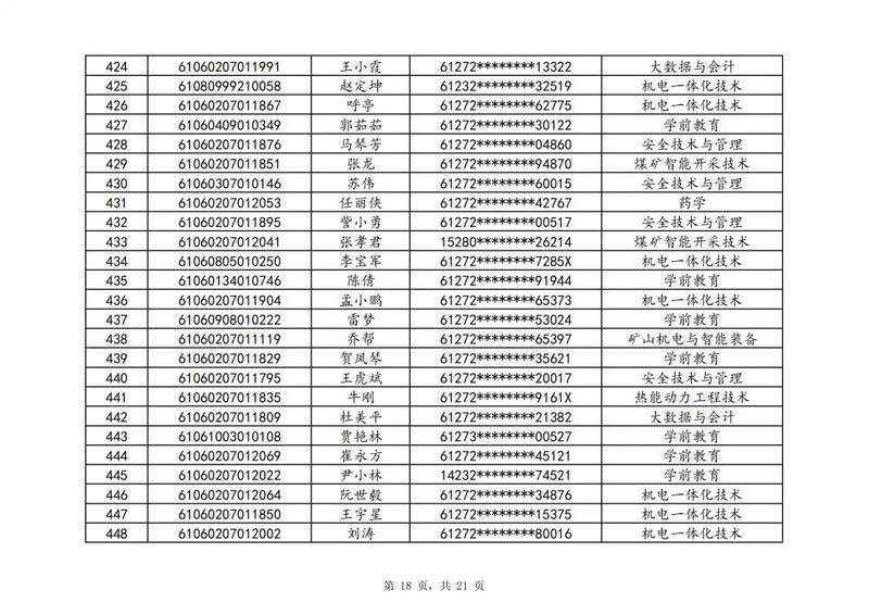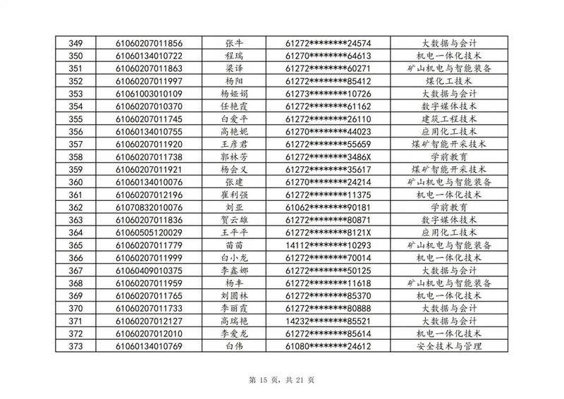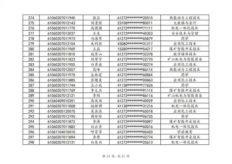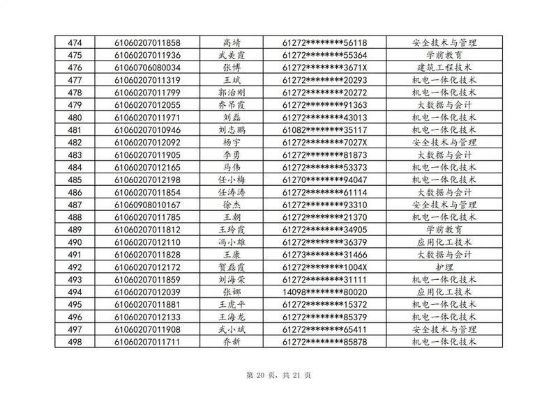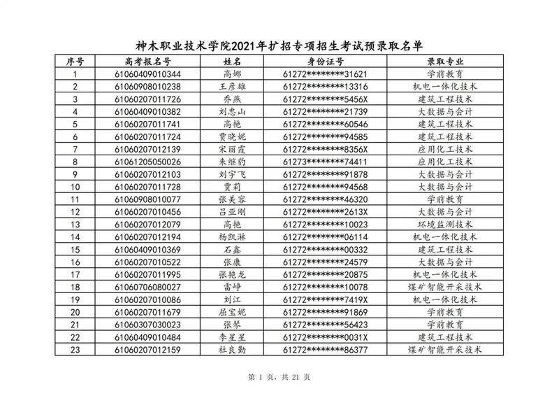 本次扩招招生中,共有3947名考生申请神木职院,参加本次扩招考试考生共621名(含免考生),最终预录取扩招考生500名,预录取最高分457分,最低分102分,平均分177分。其中下岗工人、退役军人等六类人员考生满分300分,预录取最低分102分;非六类人员考生满分580分,预录取最低分150分(如需查询成绩请登录专业填报系统:http://210.74.148.26:8001/Pro_BM/User/Login.aspx)。现将预录取考生名单予以公示,请所有公示考生于10月22日上午8:00-下午17:30携本人第二代身份证,到神木职院招生就业处(1号行政楼2层1222办公室)进行注册确认。名单如下: