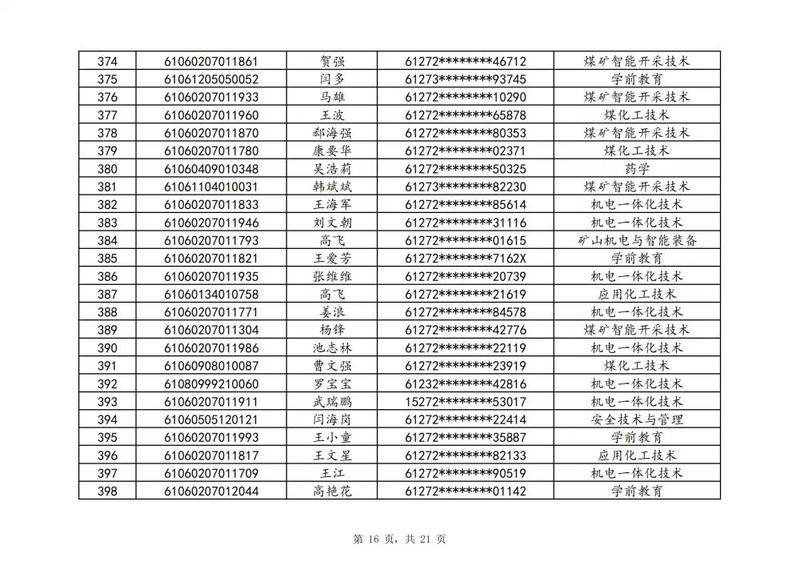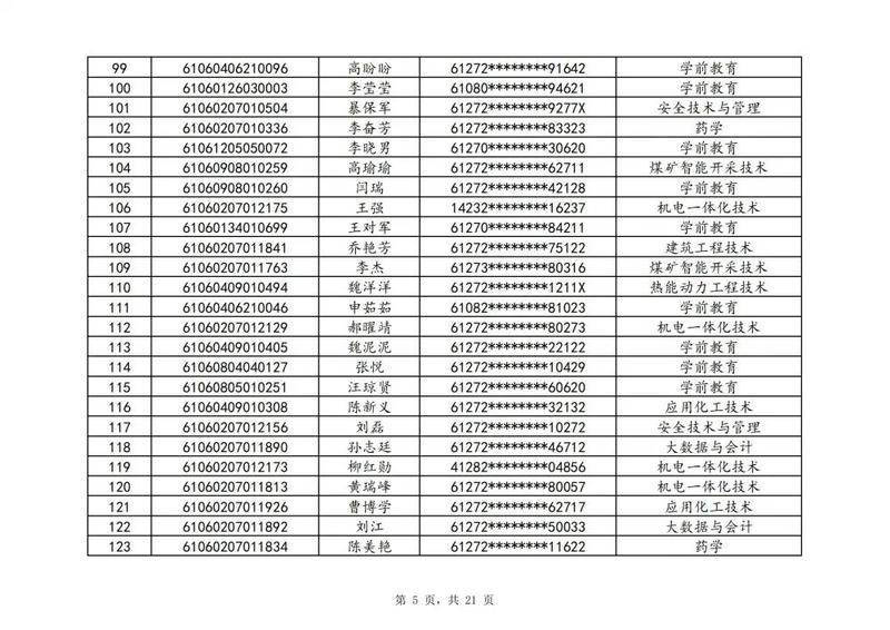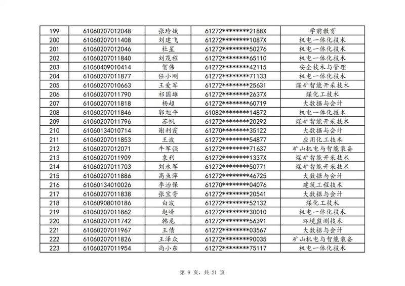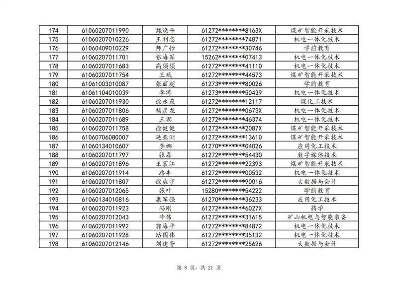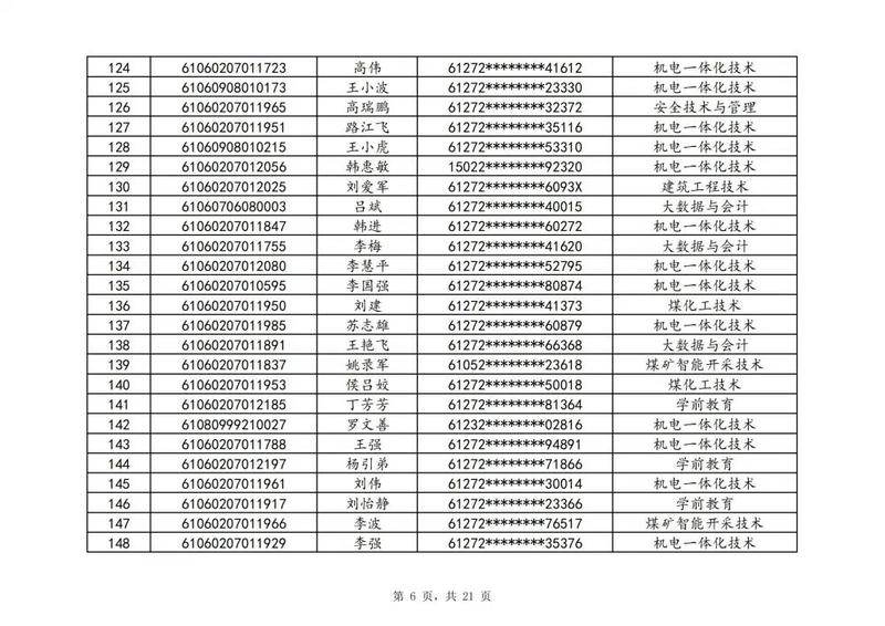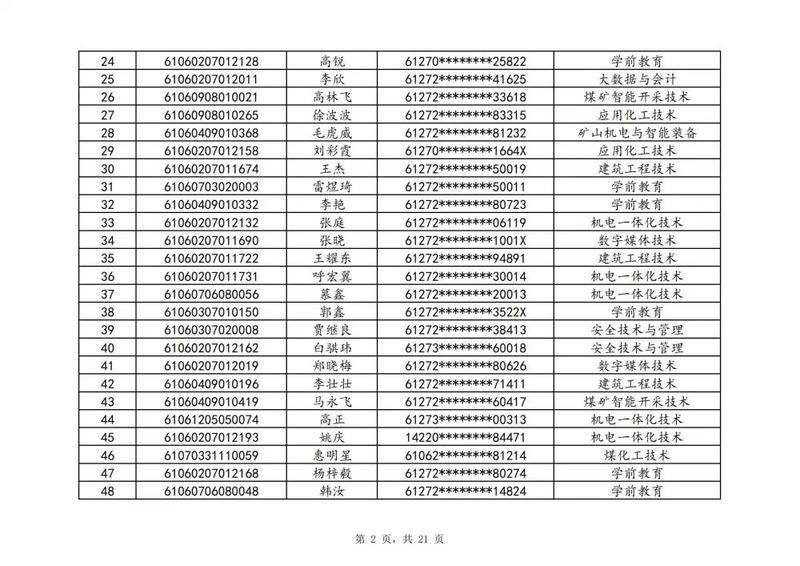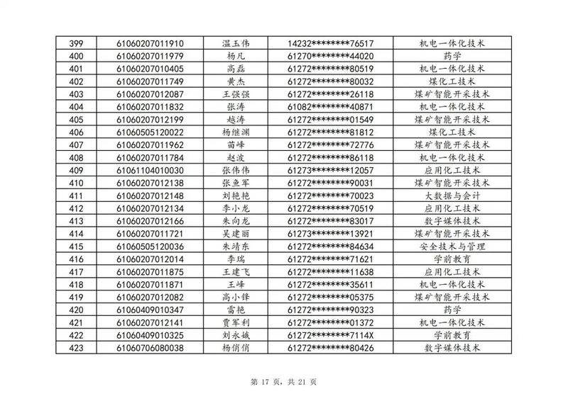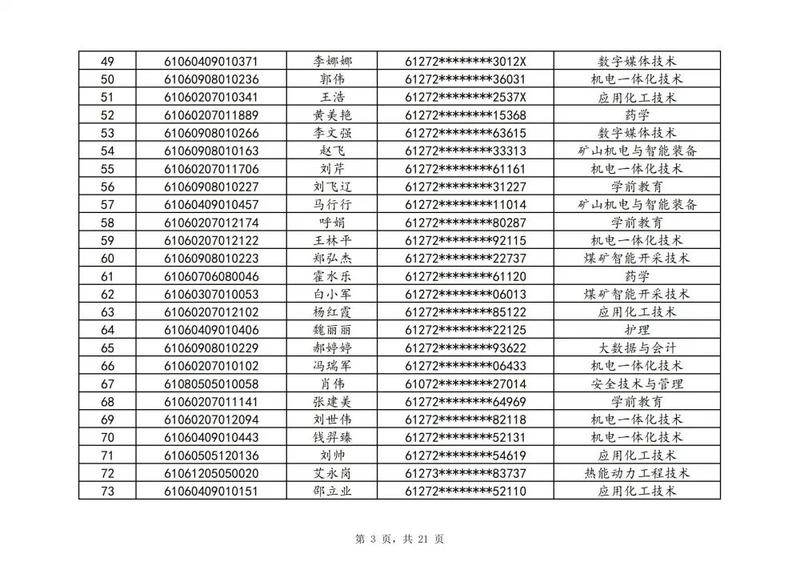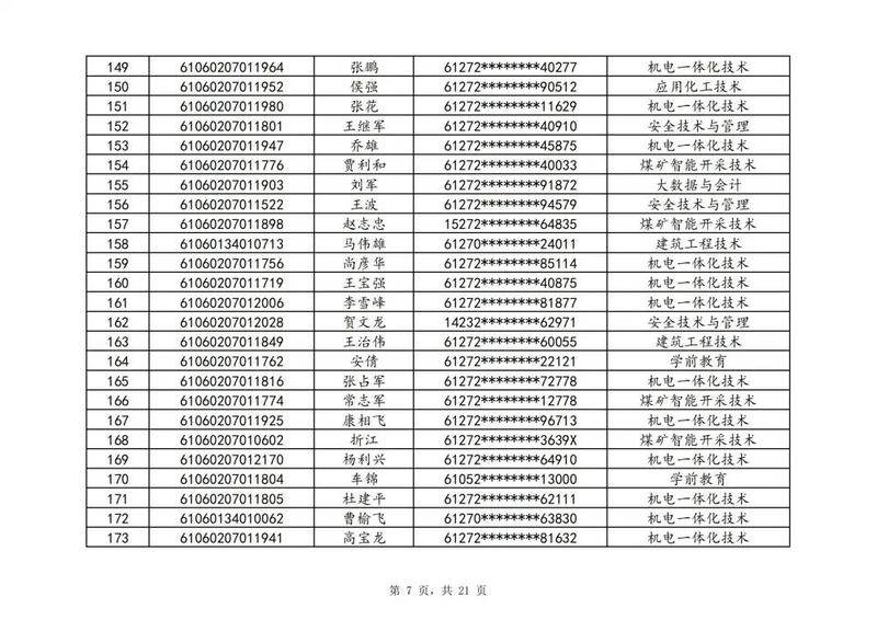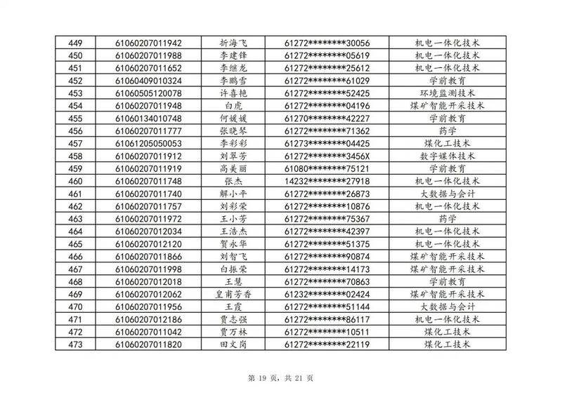 本次扩招招生中,共有3947名考生申请神木职院,参加本次扩招考试考生共621名(含免考生),最终预录取扩招考生500名,预录取最高分457分,最低分102分,平均分177分。其中下岗工人、退役军人等六类人员考生满分300分,预录取最低分102分;非六类人员考生满分580分,预录取最低分150分(如需查询成绩请登录专业填报系统:http://210.74.148.26:8001/Pro_BM/User/Login.aspx)。现将预录取考生名单予以公示,请所有公示考生于10月22日上午8:00-下午17:30携本人第二代身份证,到神木职院招生就业处(1号行政楼2层1222办公室)进行注册确认。名单如下: