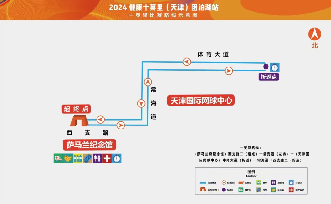 十英里:(萨马兰奇纪念馆)西支路二(起点)→常海道(左转)→体育大道(右转)→洪泽湖路(左转)→鄱阳湖路→团泊湖鸟类自然保护区(右转)→环湖西路(折返)→鄱阳湖路→洪泽湖路→体育大道→常海道→西支路二(终点)