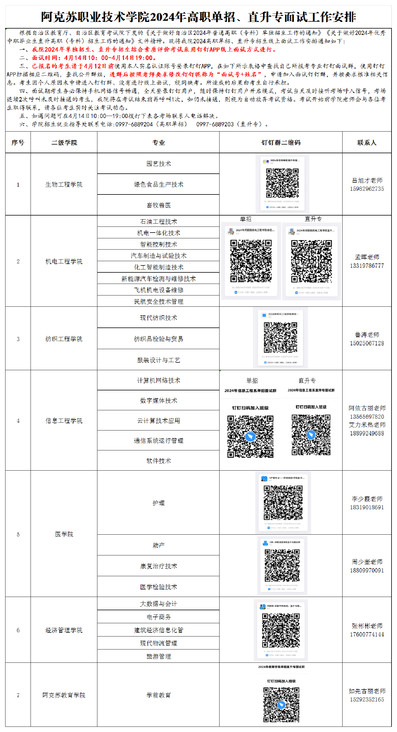 阿克苏职业技术学院2024年高职单招、直升专面试工作安排