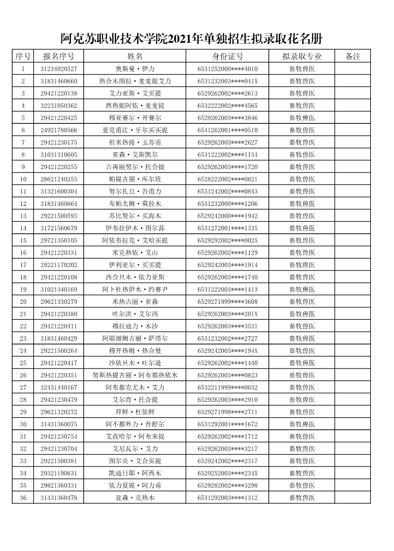根据自治区2021年单独招生工作安排,阿克苏职业技术学院2021年单独招生预录取676人,现将名单予以公示,公示时间为2021年5月15-19日,共计5天,如有异议,请在公示期内联系学院,公示期满后,请考生于5月20日至5月22日在新疆招生网(www.xjzk.gov.cn)“新疆高职单独招生考试服务平台”,点击“录取信息确认”按钮,选择是否同意录取。未在规定时间内选择同意,视为放弃本次高职单招录取。录取结束后我院将上报拟录取数据到自治区考试院审批并办理录取手续。
