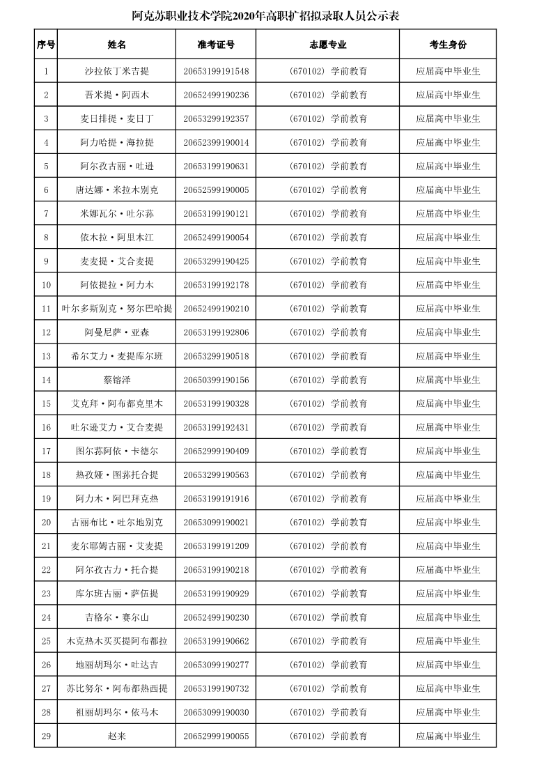 各位考生,根据《阿克苏职业技术学院2020年高职扩招招生考试考务工作方案》中录取工作的相关要求,我院高职扩招录取工作在自治区教育考试院监督指导下组织实施。拟录取考生名单已确定,现予以公示。