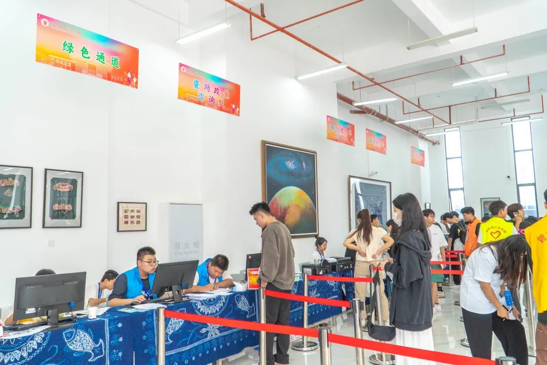 迎新现场精心布局设有多个便捷服务窗口资助政策咨询处、财务缴费处各学院报到处、住宿安排处绿色通道……此外,还有温馨舒适的休息区