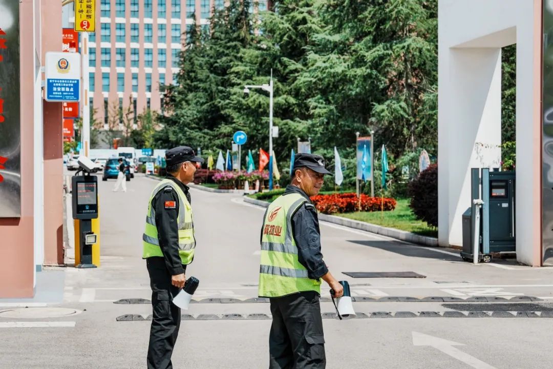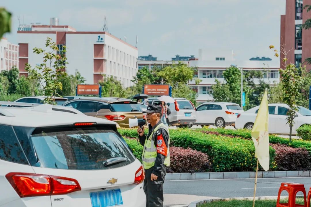 后勤安保人员早早到达点位维护秩序,指挥停车,疏导交通主动为新生及家长解决难题