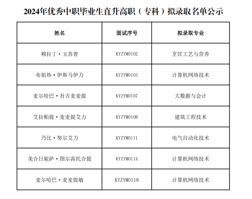 现将我院2024年优秀中职毕业生直升高职(专科)拟录取名单予以公示,公示时间: 4月22日—4月26日。考生若要放弃录取,请在公示期内提交相关材料,格式见附件。公示期满无异议者视为确认录取,我院将上报拟录取数据到自治区教育考试院审批并办理录取手续。