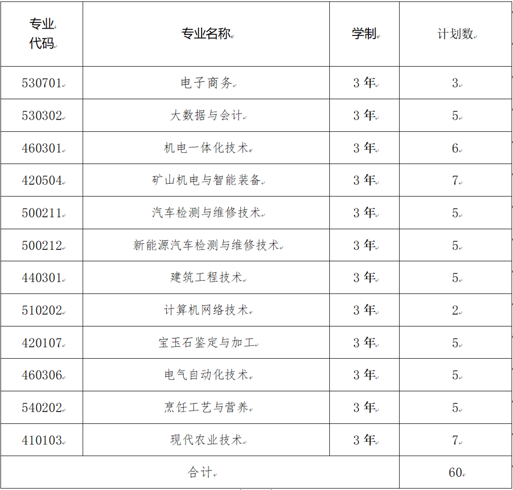 2023年学院首批开设电子商务、宝玉石鉴定与加工、建筑工程技术、汽车检测与维修技术、计算机网络技术、机电一体化技术6个专业。2024年新增矿山机电与智能装备、现代农业技术、大数据与会计、新能源汽车检测与维修技术、电气自动化技术、烹饪工艺与营养6个专业,让学生有更多专业选择。到“十五五”末,逐步建成经济管理、农牧科技、装备制造、建筑工程、网络媒体、纺织服装、旅游管理7个专业群30个专业。