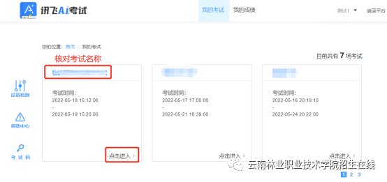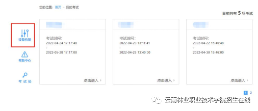 5.设备检测:点击进入讯飞AI考试(在线)后,在“我的考试”页面中选择对应的考试。先点击“设备检测”,进行设备检测如果弹出访问摄像头权限弹窗,须点击“允许”按钮。