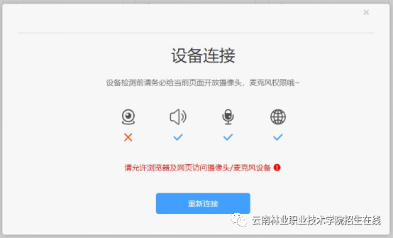 点击“重新链接”或“开始检测”,根据实际电脑情况选择可以看到、可以听到,完成检测后,点击“完成检测”。