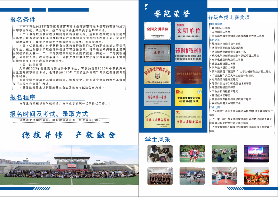3.优惠政策:对于获得自治区和兵团教育行政部门认可的职业技能大赛其他自治区级奖项的学生,可优先录取。对于在校期间获得全国职业院校技能大赛一、二、三等奖或自治区职业院校技能大赛一、二等奖获得者,可免试入学。在同等条件下,学院优先录取申请就读专业与获奖项目(或中职就读专业)相对应或相近的学生。
