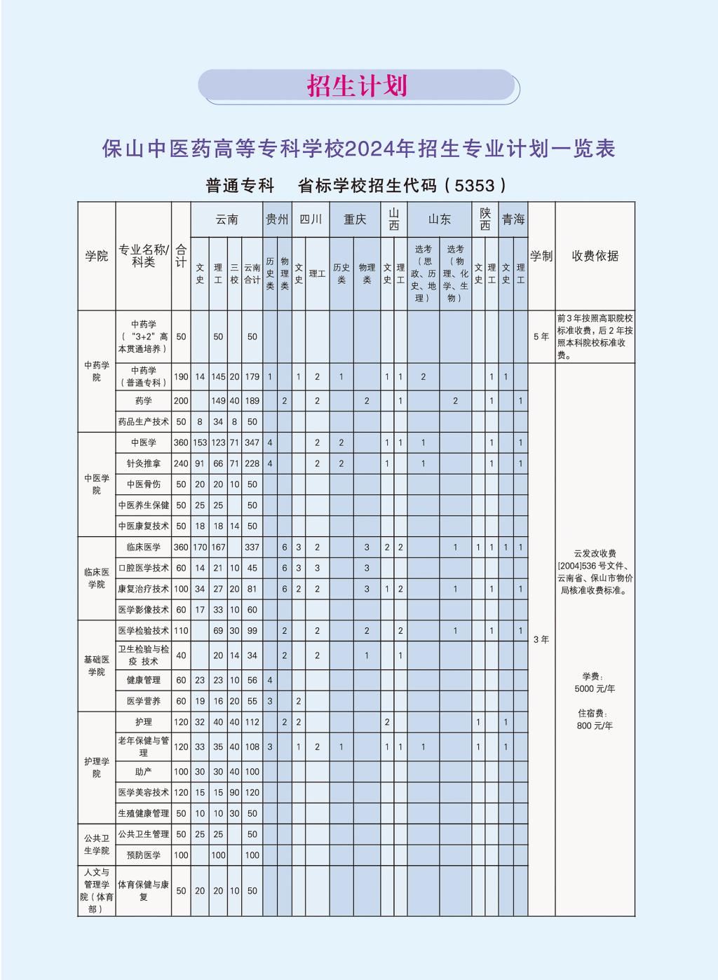 保山中医药高等专科学校2024年招生计划(普通专科)