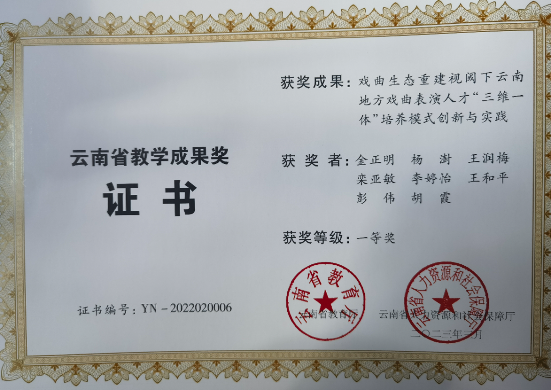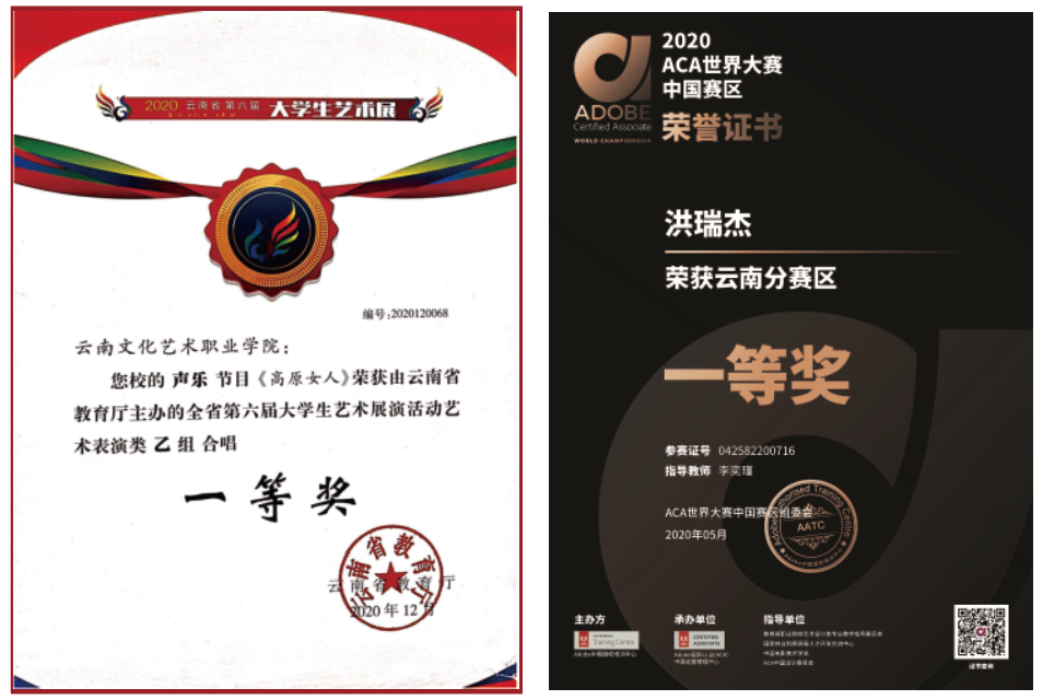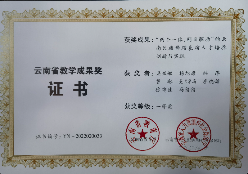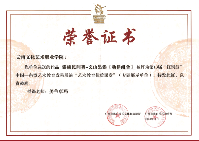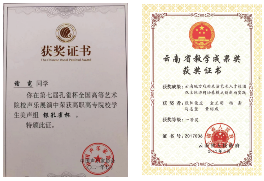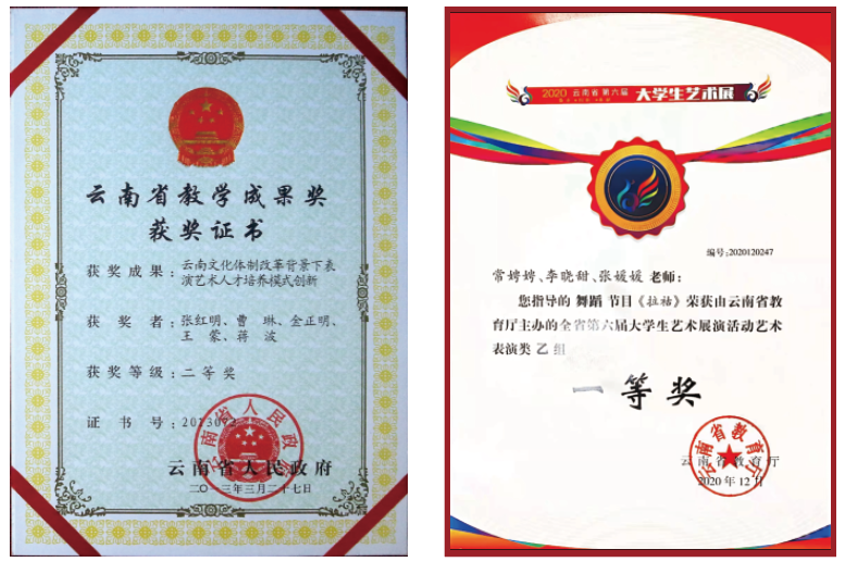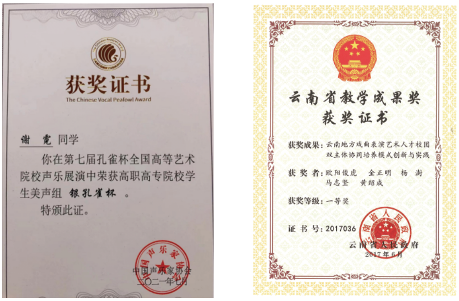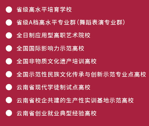 学校经有关部门认定为云南省少数民族艺术人才培养基地、云南省非物质文化遗产(滇剧、花灯)传承基地、云南华文教育基地、云南民族文化传承创新重点骨干院校、全国职业院校民族文化传承与创新示范专业点、云南省第二批现代学徒制试点高校(戏曲表演、杂技与魔术表演、美术及实用美术、影视美术四个专业现代学徒制省级试点项目)、云南省校企共建的生产性实训基地示范高校、云南省创业就业典型经验高校;2016、2017年连续两年上榜中国高等职业院校国际影响力50强;2021年获批省级高水平学校培育单位,舞蹈表演专业群获批省级A档高水平专业群建设项目。