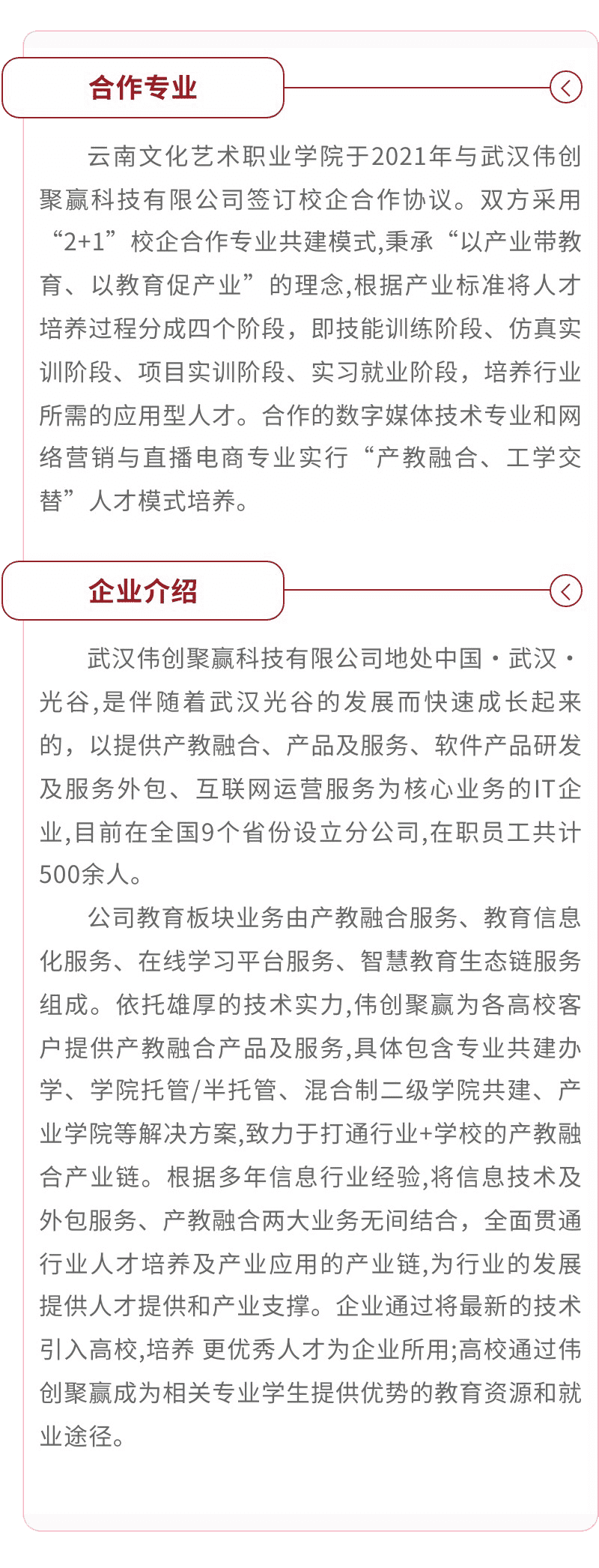 2001年9月,云南省艺术学校与云南电影学校合并,组建新的云南省艺术学校;2004年5月云南省艺术学校与云南省文化厅职工大学合并,组建云南文化艺术职业学院,以培养实用型中高级文化艺术人才为办学目标。2006年因艺术人才培养的特殊需要,经云南省教育厅批准学院恢复并加挂云南省艺术学校”牌子,保留中等艺术教育,形成大中专一体化办学格局。