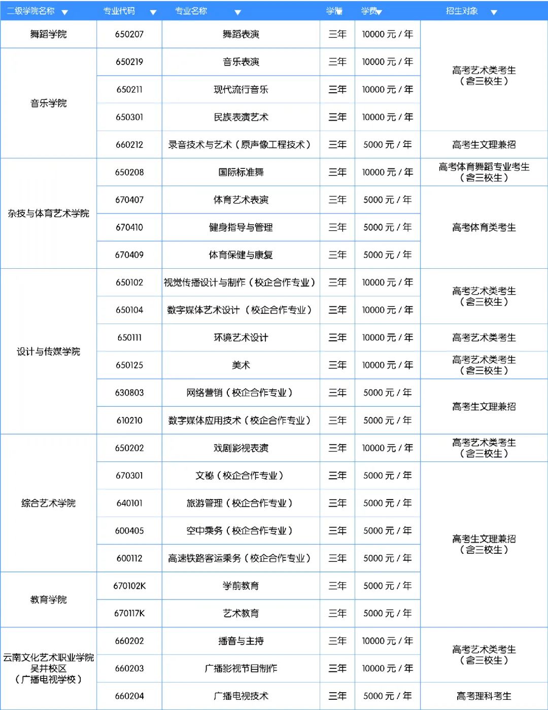 综合艺术学院现有戏剧影视表演、空中乘务、高速铁路客运乘务、文秘、文化市场经营管理、播音与主持、旅游管理7个专业,其中播音与主持、旅游管理专业目前为云南文化艺术职业学院和云南省广播电视学校一体化办学。