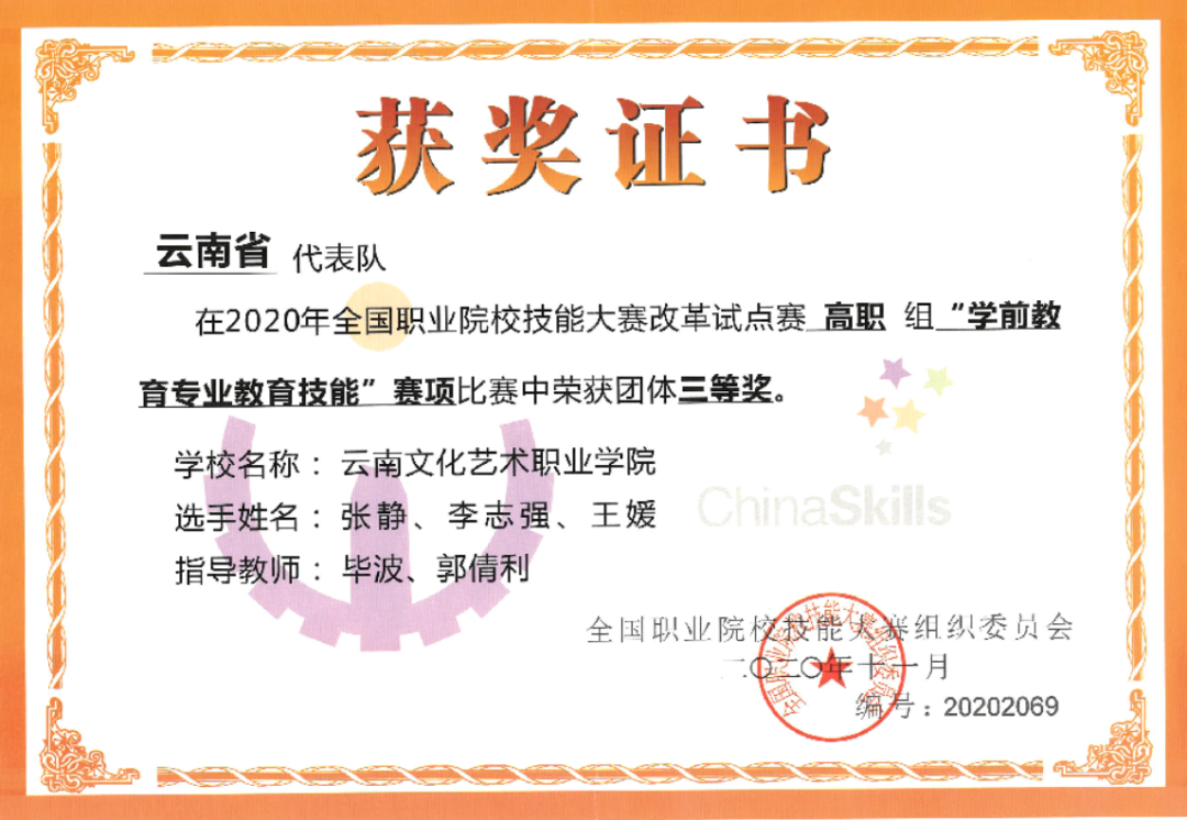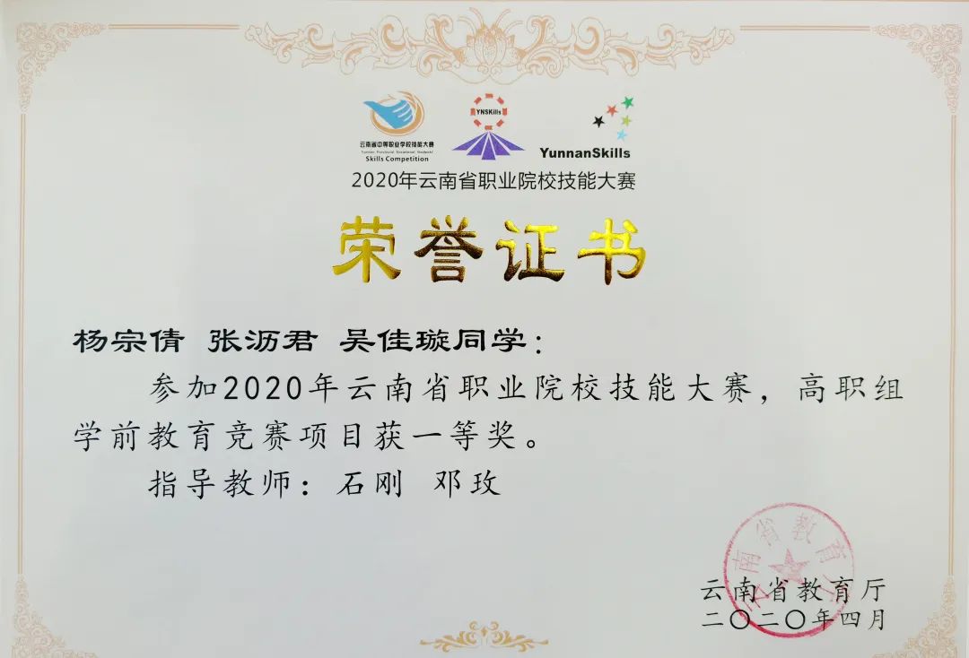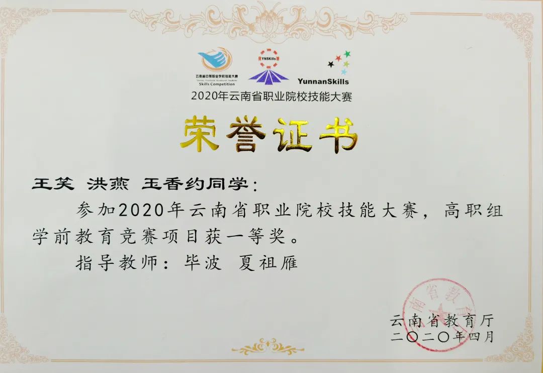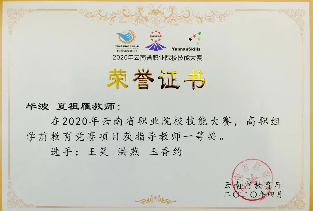 近年来,学院本着夯实专业建设,优化人才培养方案,系统设计实践技能课程体系,提升课堂质量,健全育训结合、德技并修的育人体制,办学成绩日益显著,在2018年、2020年云南省高等学校教师教学能力比赛中五名教师获得三等奖。2017年、2019年、2020年教育学院学生参加云南省职业院校技能大赛学前教育专业赛项荣获一、二等奖,并代表云南省参加2018年、2019年、2020年全国职业院校技能大赛学前教育专业赛项的比赛。在2020年全国职业院校技能大赛学前教育赛项中荣获三等奖,突破了云南在全国职业院校技能大赛高职组“学前教育专业教育技能”赛项零获奖的记录。