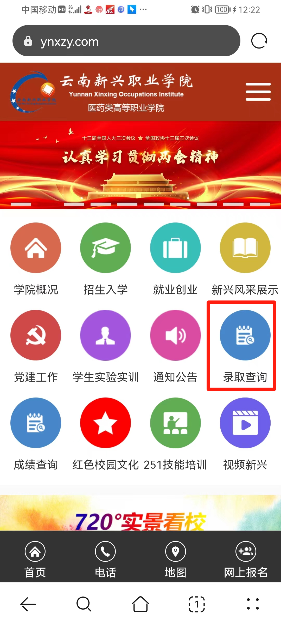 2、手机端操作:在手机浏览器输入:www.ynxzy.com进入学校官网,找到如下图片中“录取查询”位置进入查询界面,输入准考证号、身份证号、验证码(不区分大小写字母)点击查询即可。