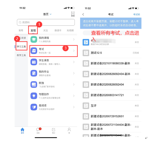 方式二:学校发起了考试后,点击首页——发现——学习工具——考试,点击进入考试即可。