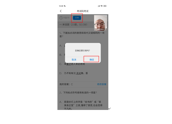 2.本次考试全程进行录像监控,进行前后摄像头抓拍和屏幕抓拍,请调整好答题姿势,确保面部头像完整显示,屏幕抓拍只应用于考试监考,不会获取其他信息。由于本次考试需要进行人脸识别监控和屏幕抓拍,系统需要获取您的摄像头权限,请确认同意。进行人脸识别时,请摘下口罩。