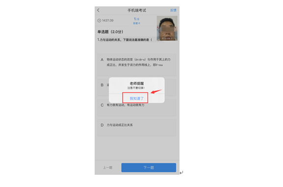 9.考试在接收到监控老师提醒后,需点击“我知道了”,方可继续答题。