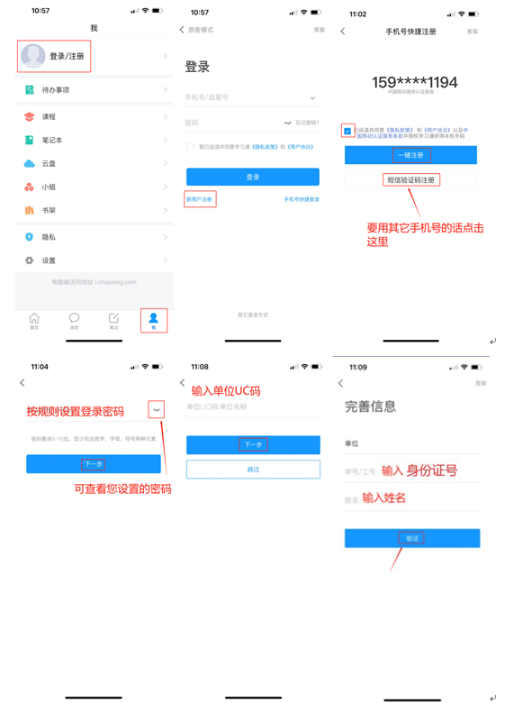 2.登录学习通下载学习通,手机端打开学习通APP,点击“我”页面顶端“登录/注册”。首次登录,点新用户注册识别本机号码快捷注册,想用其它手机号注册,点击“短信验证码注册”后输入其他手机号,获取验证码,根据密码规则设置密码,再根据提示注册账号,并绑定学号(学号处为:身份证号码)完善信息,如下图所示: