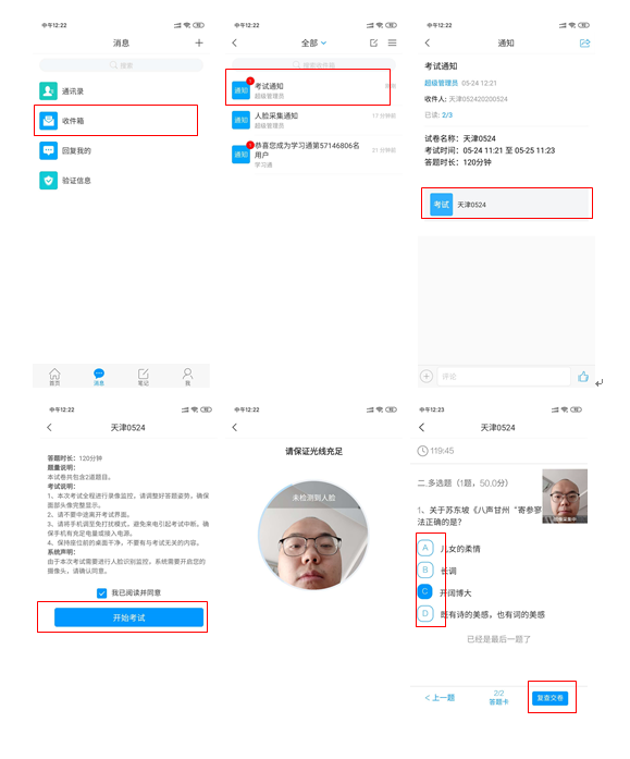 二、开始考试方式一:学校发起了考试通知,点击通知进入考试即可。