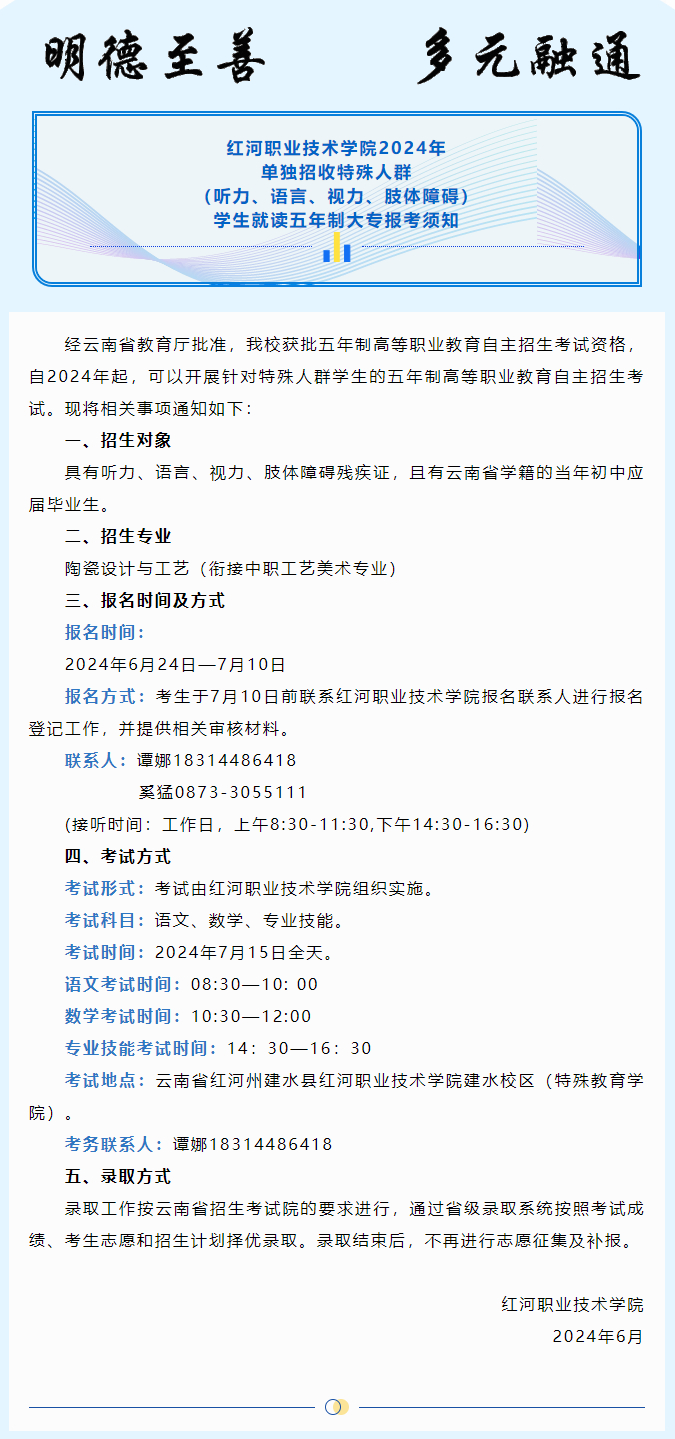 红河职业技术学院2024年单独招收特殊人群(听力、语言、视力、肢体障碍)学生就读五年制大专报考须知