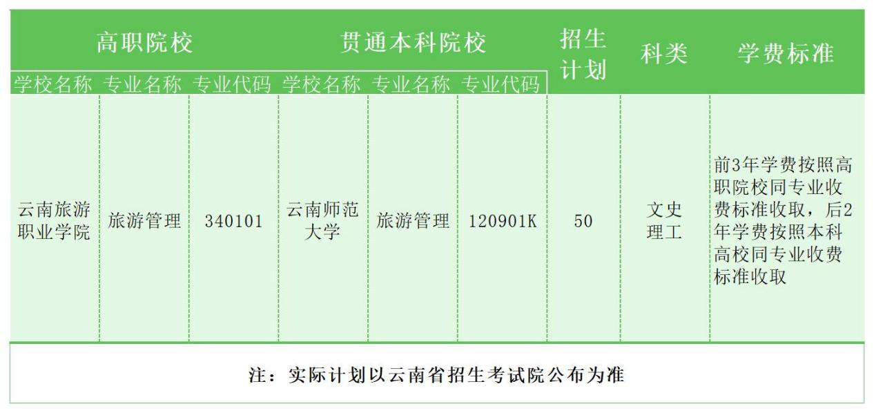 根据云南省教育厅《关于启动实施2024年职业教育贯通培养改革试点工作的通知》,云南旅游职业学院获批2024年云南省高本“3+2”贯通培养改革试点项目院校,云南旅游职业学院旅游管理专业与云南师范大学旅游管理专业合作开展高本“3+2”贯通培养。2024年正式招生,招生计划50人。