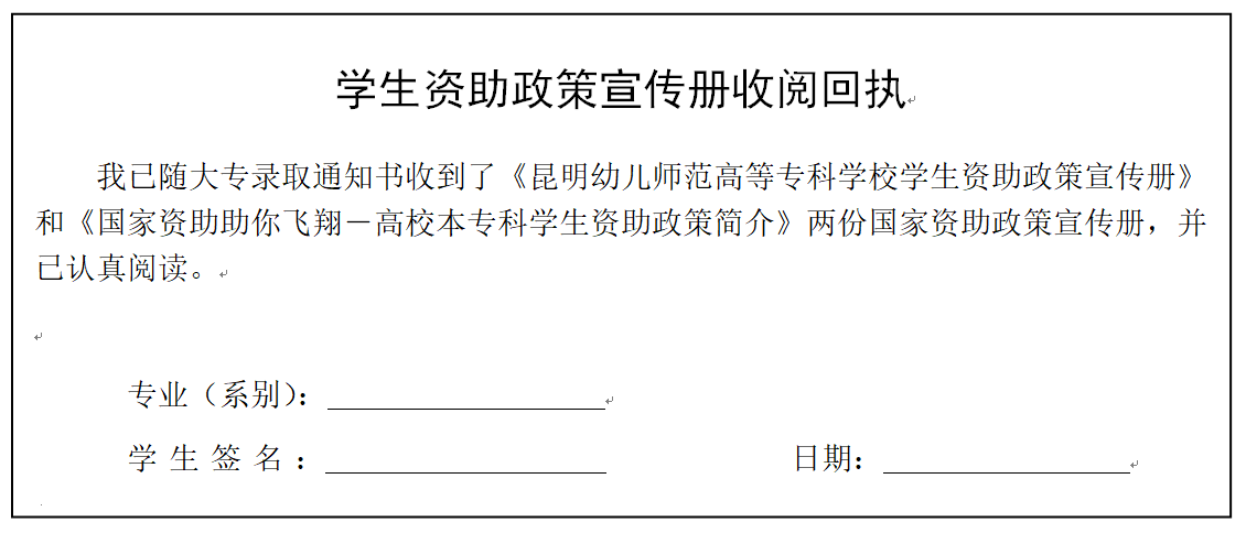 为确保我校录取的每一位新生都能知晓国家资助助学政策,使国家的惠民政策落到实处,请每一位同学认真阅读学习了解《昆明幼儿师范高等专科学校学生资助政策宣传册》和《国家资助助你飞翔-高校本专科学生资助政策简介》,并填写好下面的《学生资助政策宣传册收阅回执》,于开学报到时交到学校。
