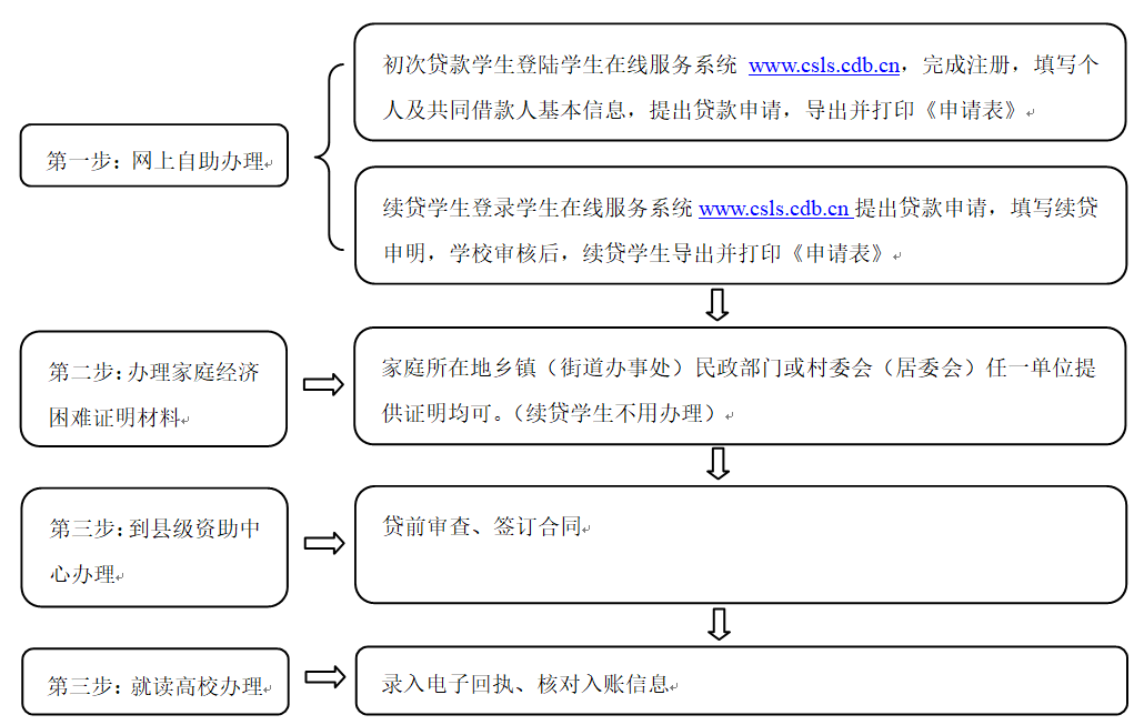 答:借款学生与共同借款人身份证原件及复印件一份、户口簿原件、借款学生本人签字的《申请表》原件。初次借款学生还需提供家庭所在地乡镇(街道办事处)民政部门或村委会(居委会)任一单位出具的学生家庭经济困难证明(建档立卡贫困户学生无需提供家庭经济困难证明)。