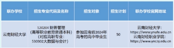 2024年,经云南省教育厅批准,我校大数据与会计专业与云南财经大学高等职业教育普通本科财务管理专业开展“3+2”高本贯通培养改革试点项目招生。试点项目建立以云南财经大学为主导,云南财经职业学院、校企合作企业积极参与的项目管理机制。试点项目坚持人才市场需求导向,遵循技术技能人才成长规律,培养理论基础扎实、专业技能水平高、就业创业能力强、综合素养突出的高素质技术技能型高级人才。
