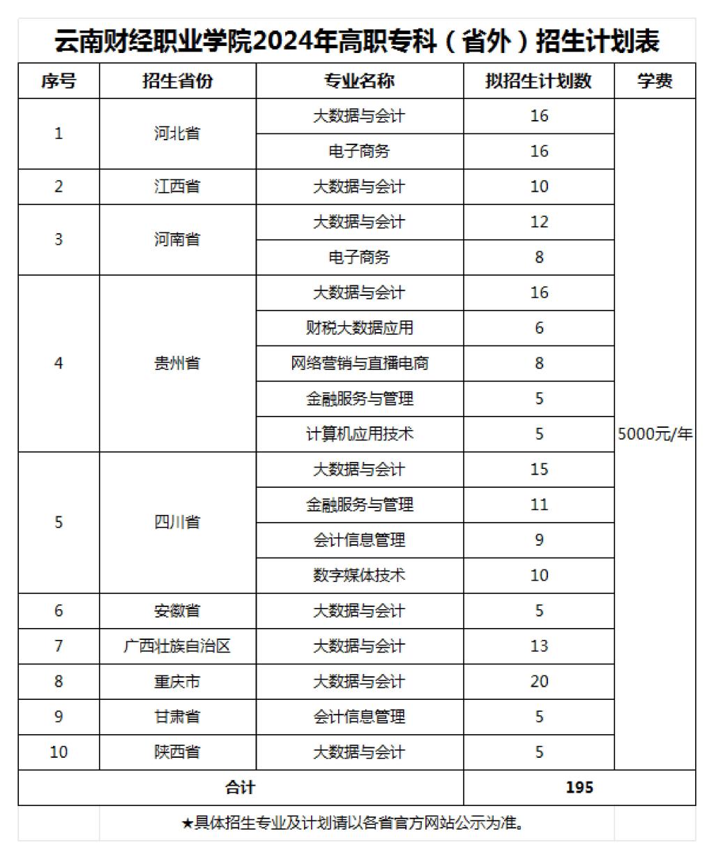 云南财经职业学院2024年高职专科(省外)招生计划表